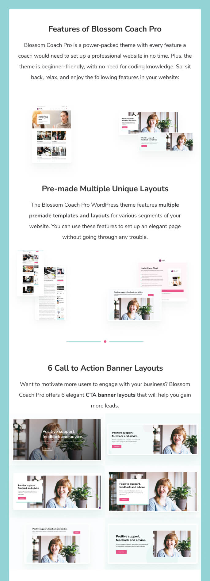 Want to motivate more users to engage with your business? Blossom Coach Pro offers 6 elegant CTA banner layouts that will help you gain more leads.
