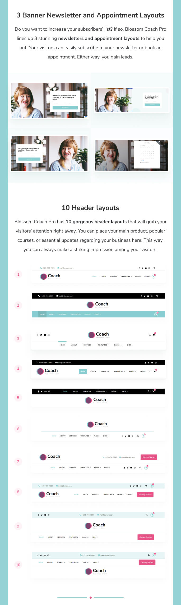 Do you want to increase your subscribers’ list? If so, Blossom Coach Pro lines up 3 stunning newsletters and appointment layouts to help you out. Your visitors can easily subscribe to your newsletter or book an appointment. Either way, you gain leads.
