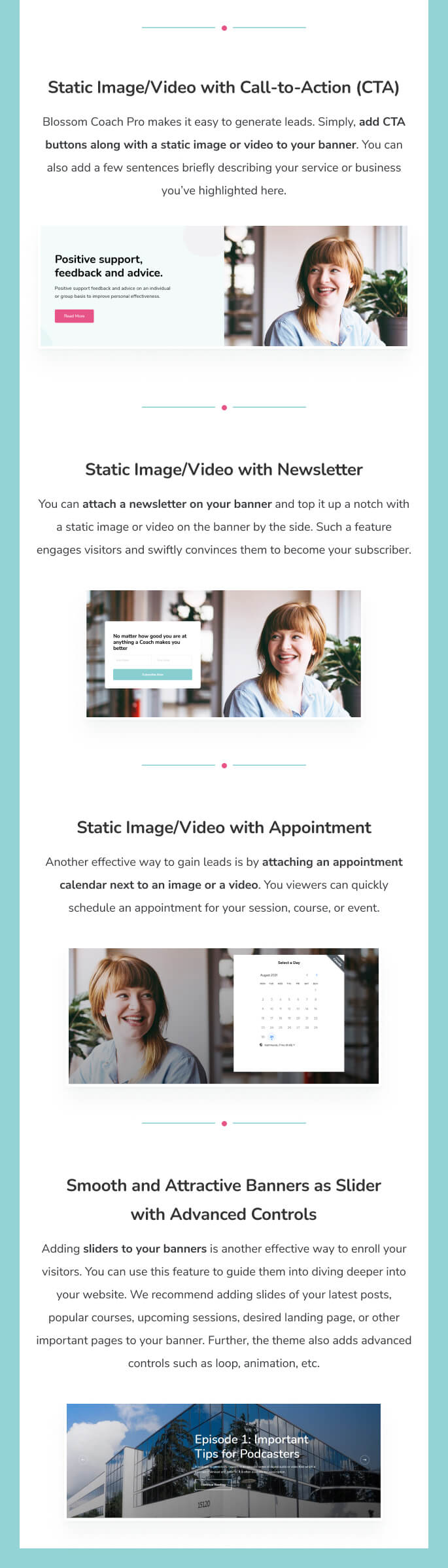 Blossom Coach Pro makes it easy to generate leads. Simply, add CTA buttons along with a static image or video to your banner. You can also add a few sentences briefly describing your service or business you’ve highlighted here.