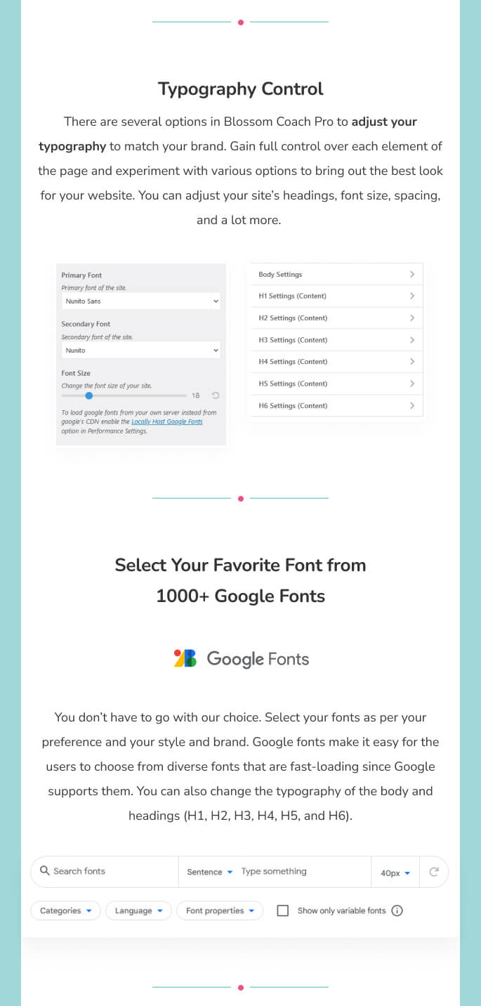You don’t have to go with our choice. Select your fonts as per your preference and your style and brand. Google fonts make it easy for the users to choose from diverse fonts that are fast-loading since Google supports them. You can also change the typography of the body and headings (H1, H2, H3, H4, H5, and H6).
