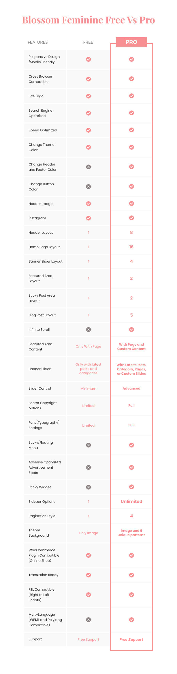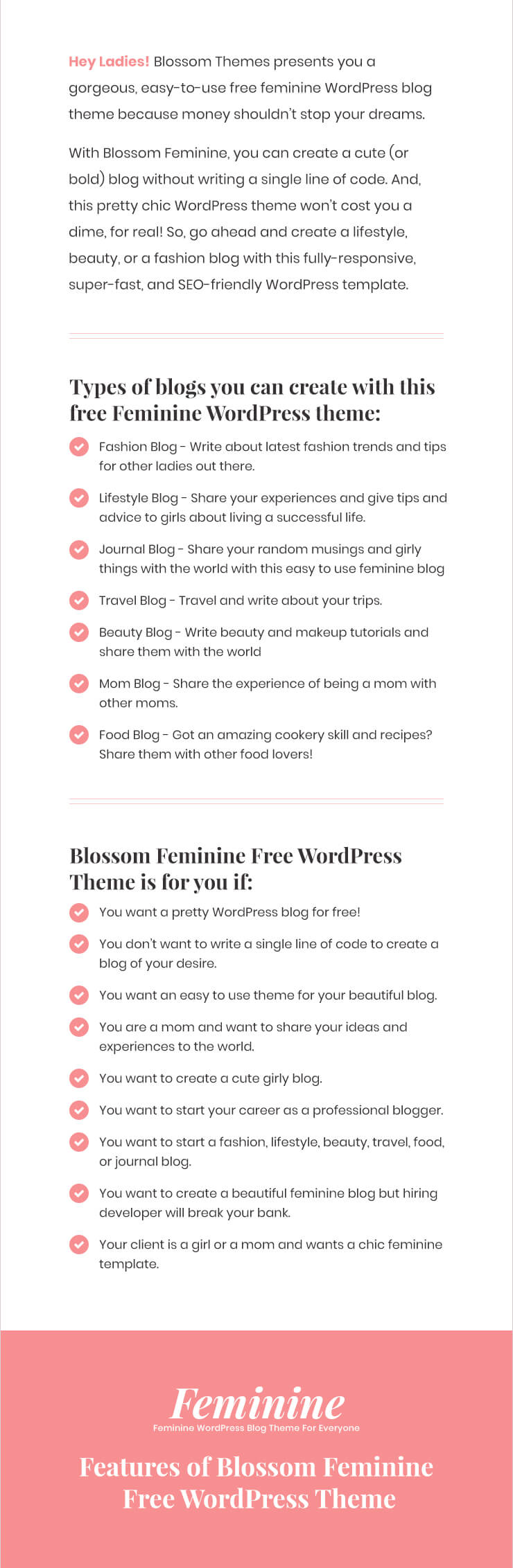 Hey Ladies! Blossom Themes presents you a gorgeous, easy-to-use free feminine WordPress blog theme because money shouldn’t stop your dreams. With Blossom Feminine, you can create a cute (or bold) blog without writing a single line of code. And, this pretty chic WordPress theme won’t cost you a dime, for real! So, go ahead and create a lifestyle, beauty, or a fashion blog with this fully-responsive, super-fast, and SEO-friendly WordPress template.