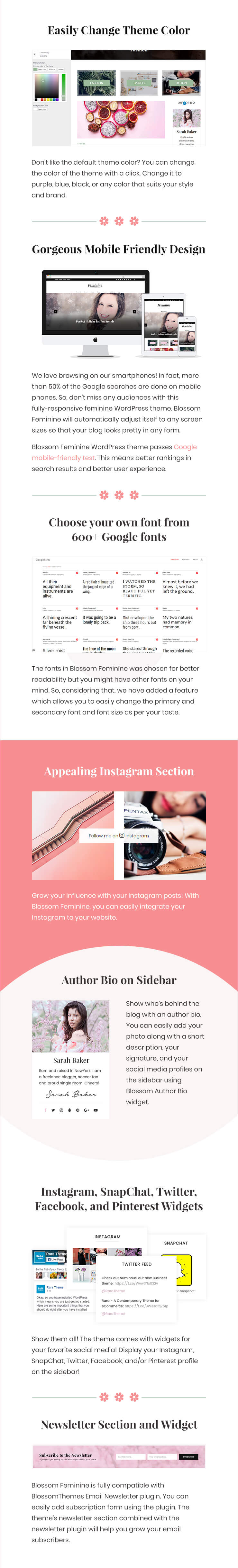 The fonts in Blossom Feminine was chosen for better readability but you might have other fonts on your mind. So, considering that, we have added a feature which allows you to easily change the primary and secondary font, font size and line light as per your taste.