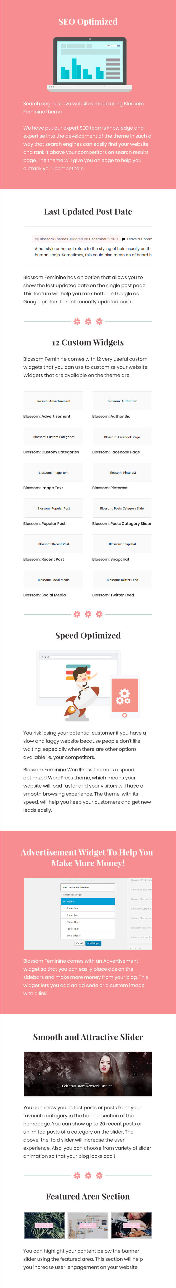 Blossom Feminine WordPress theme is a speed optimized WordPress theme, which means your website will load faster and your visitors will have a smooth browsing experience. The theme, with its speed, will help you keep your customers and get new leads easily.