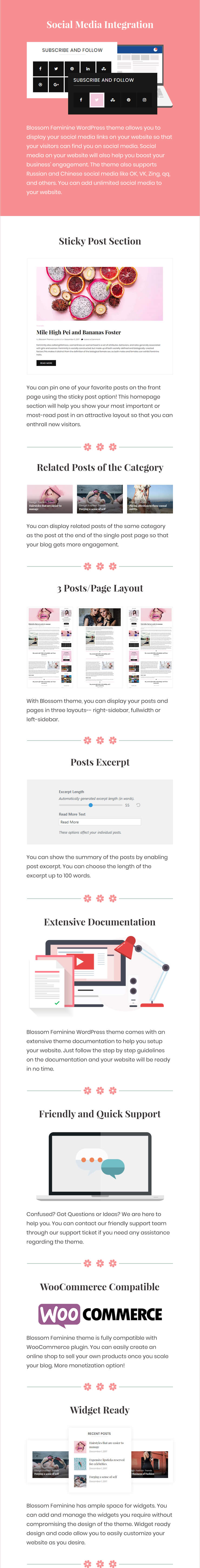 With the perfect font type, size, spaces, and contrast, Blossom Feminine makes sure that your content is easy on the eye and your visitors enjoy reading what you have to say.
