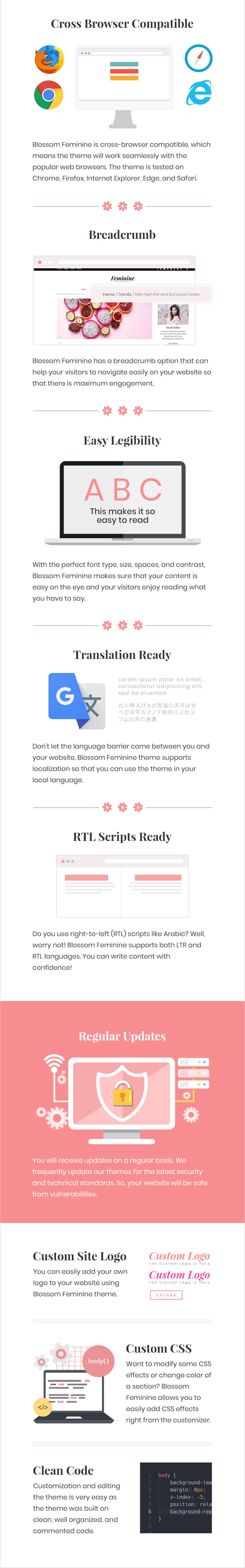 Blossom Feminine is cross-browser compatible, which means the theme will work seamlessly with the popular web browsers. The theme is tested on Chrome, Firefox, Internet Explorer, Edge, and Safari.