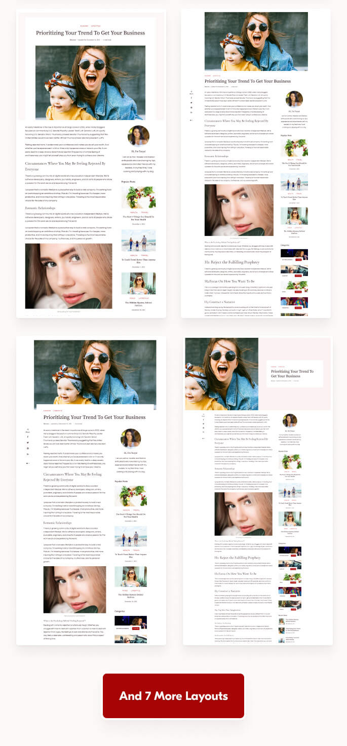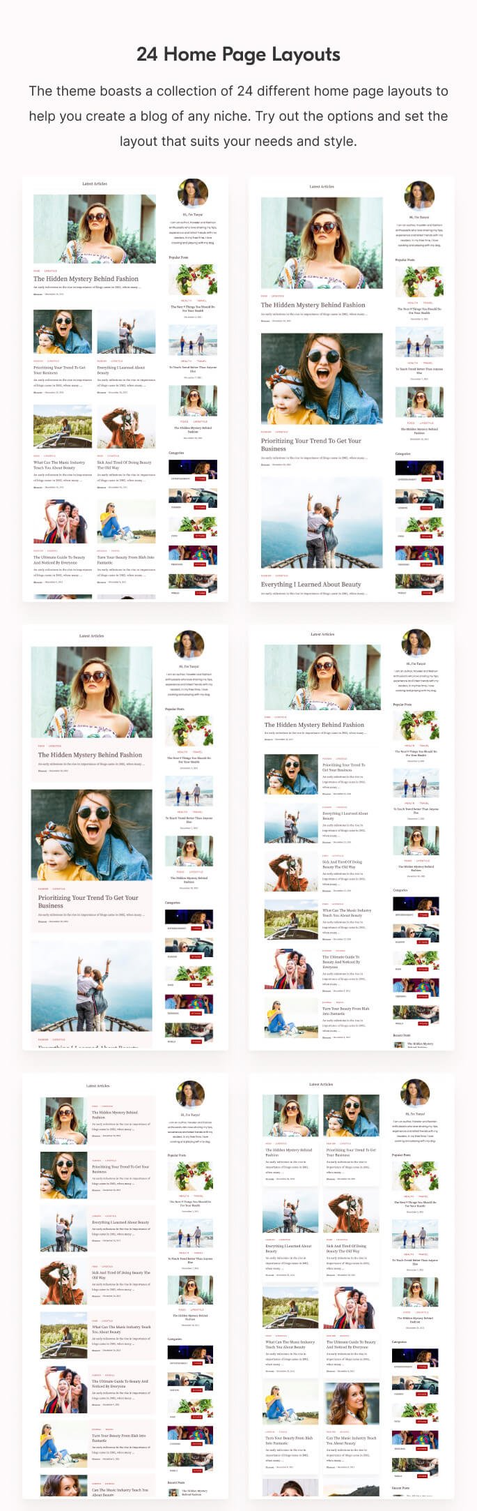 The theme boasts a collection of 24 different home page layouts to help you create a blog of any niche. Try out the options and set the layout that suits your needs and style.