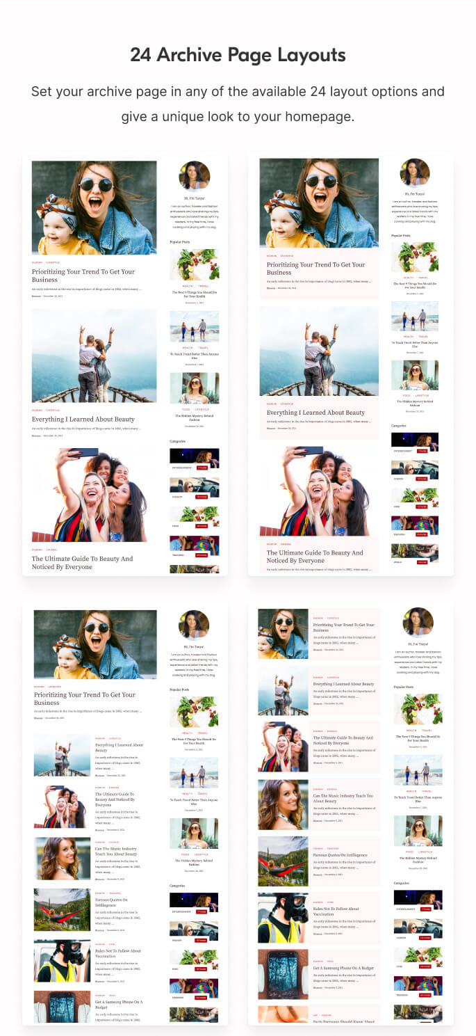 Set your archive page in any of the available 24 layout options and give a unique look to your homepage.