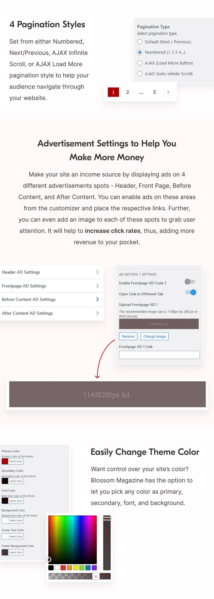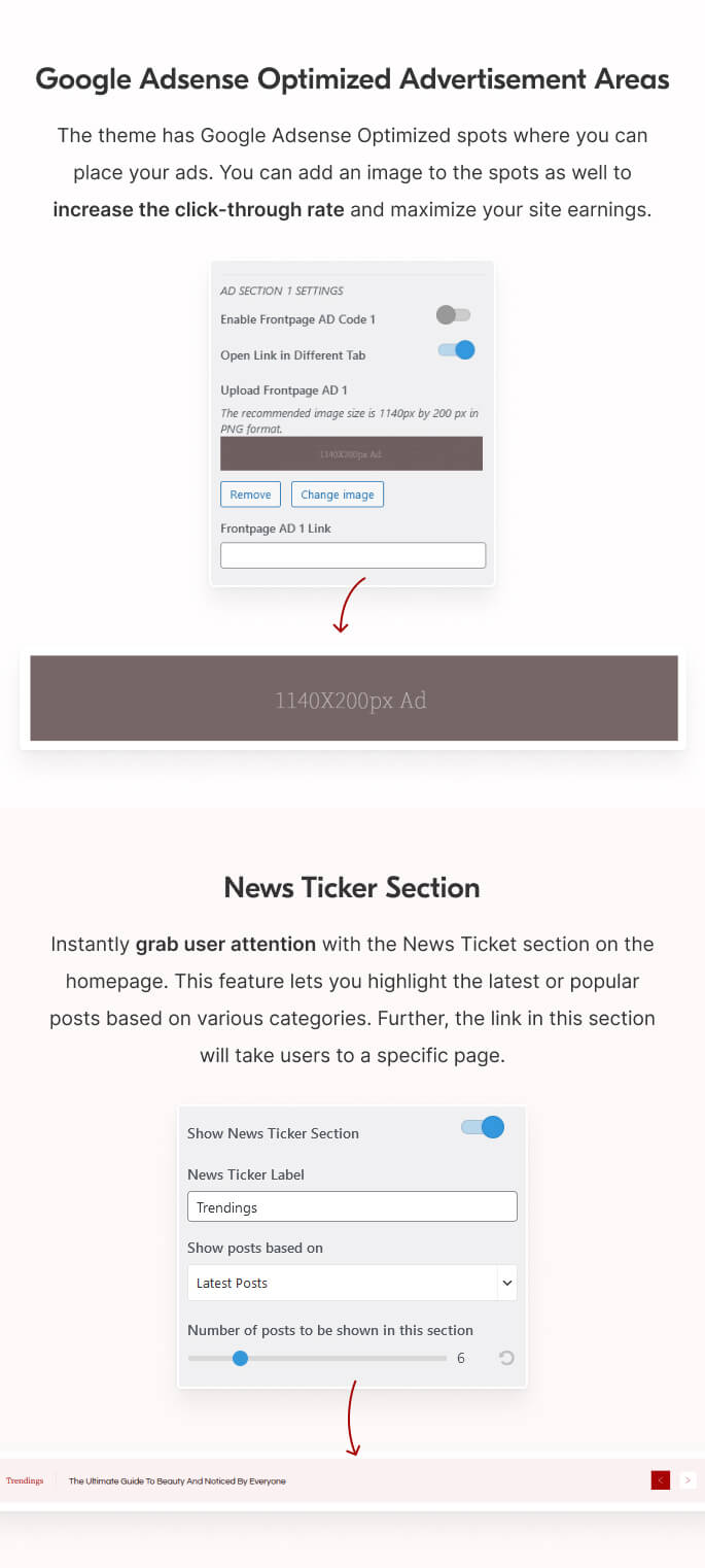 You can enable ads on these areas from the customizer and place the respective links. Further, you can even add an image to each of these spots to grab user attention. It will help to increase click rates, thus, adding more revenue to your pocket.