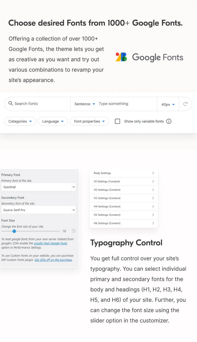 You get full control over your site’s typography. You can select individual primary and secondary fonts for the body and headings (H1, H2, H3, H4, H5, and H6) of your site. Further, you can change the font size using the slider option in the customizer.