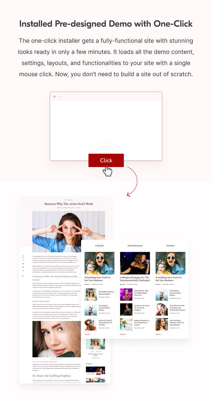 The one-click installer gets a fully-functional site with stunning looks ready in only a few minutes. It loads all the demo content, settings, layouts, and functionalities to your site with a single mouse click. Now, you don’t need to build a site out of scratch.