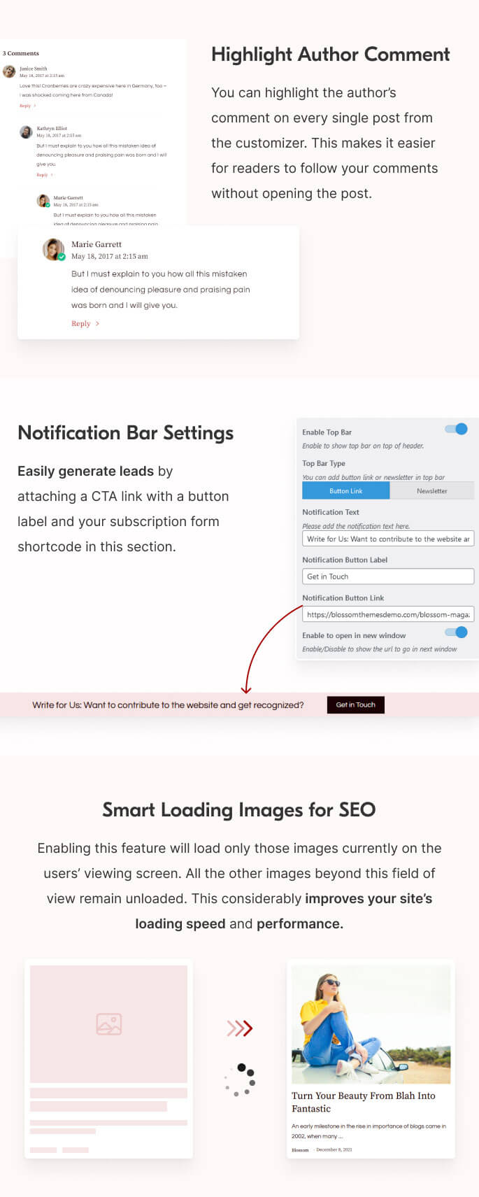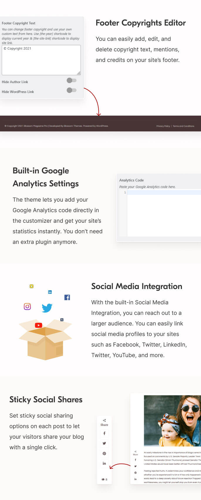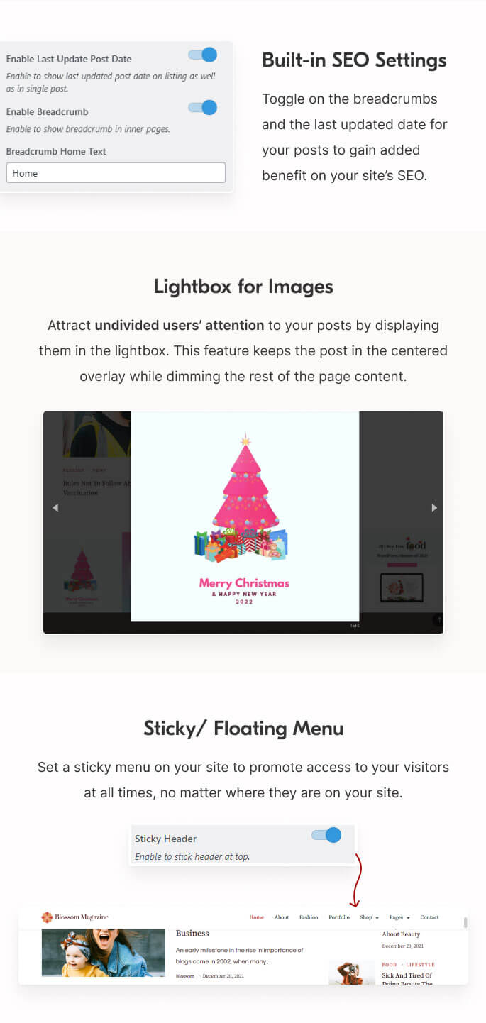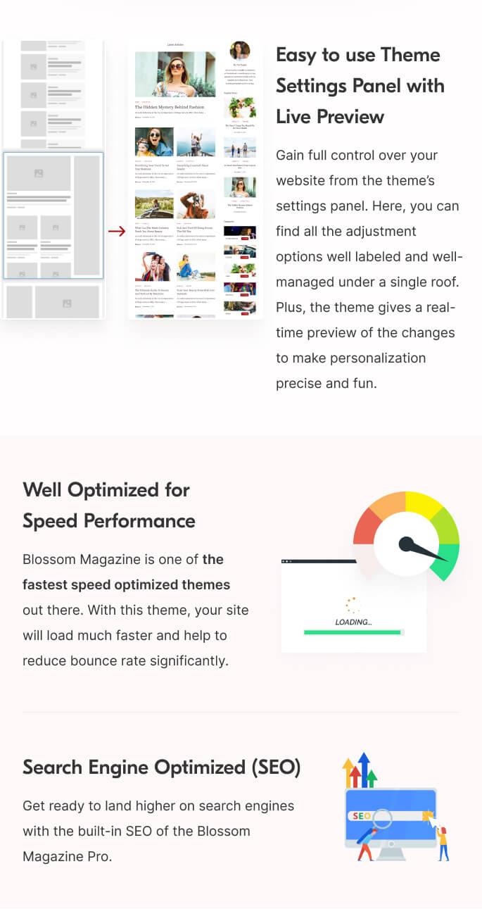 Get ready to land higher on search engines with the built-in SEO of the Blossom Magazine Pro.