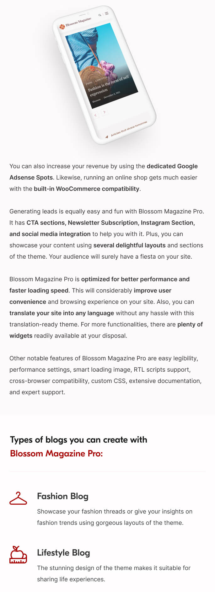 Other notable features of Blossom Magazine Pro are easy legibility, performance settings, smart loading image, RTL scripts support, cross-browser compatibility, custom CSS, extensive documentation, and expert support.