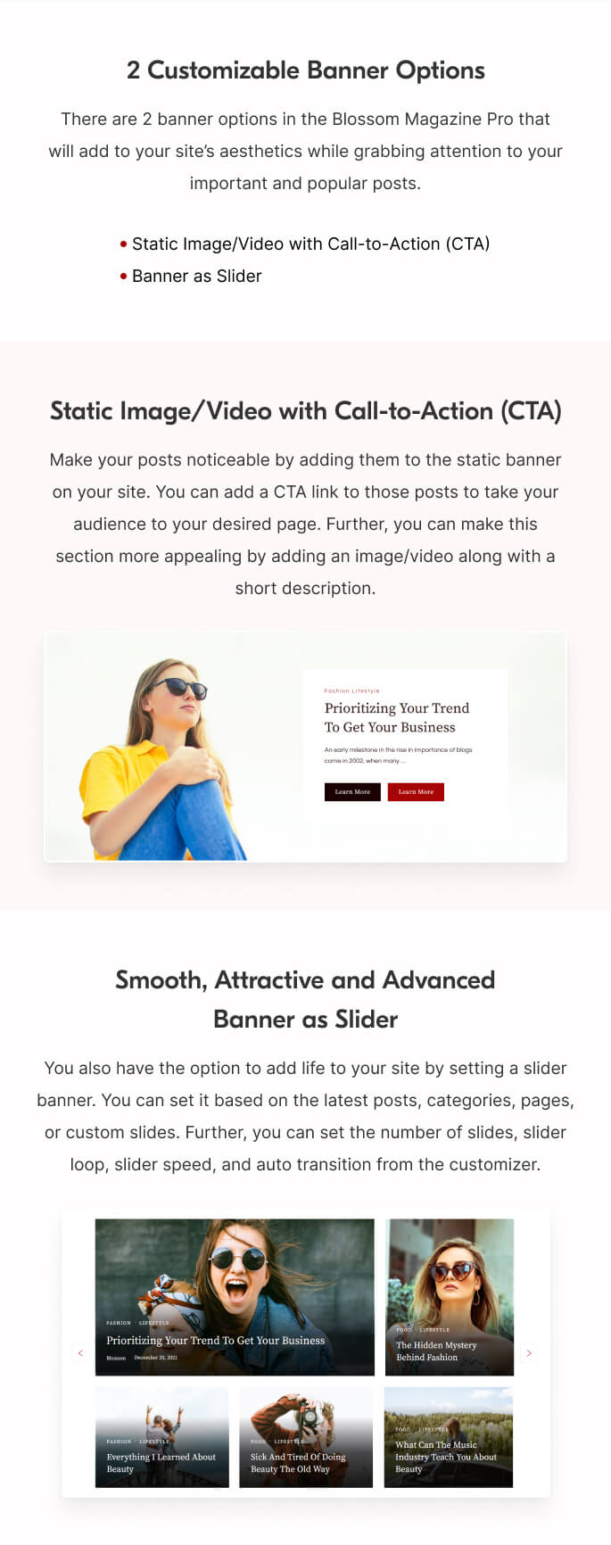 There are 2 banner options in the Blossom Magazine Pro that will add to your site’s aesthetics while grabbing attention to your important and popular posts.