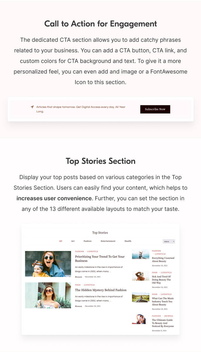 Display your top posts based on various categories in the Top Stories Section. Users can easily find your content, which helps to increases user convenience. Further, you can set the section in any of the 13 different available layouts to match your taste.