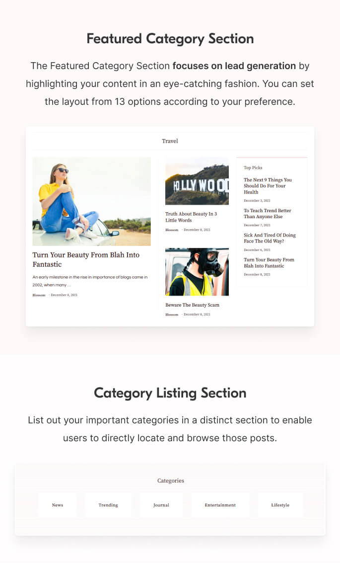 The Featured Category Section focuses on lead generation by highlighting your content in an eye-catching fashion. You can set the layout from 13 options according to your preference.