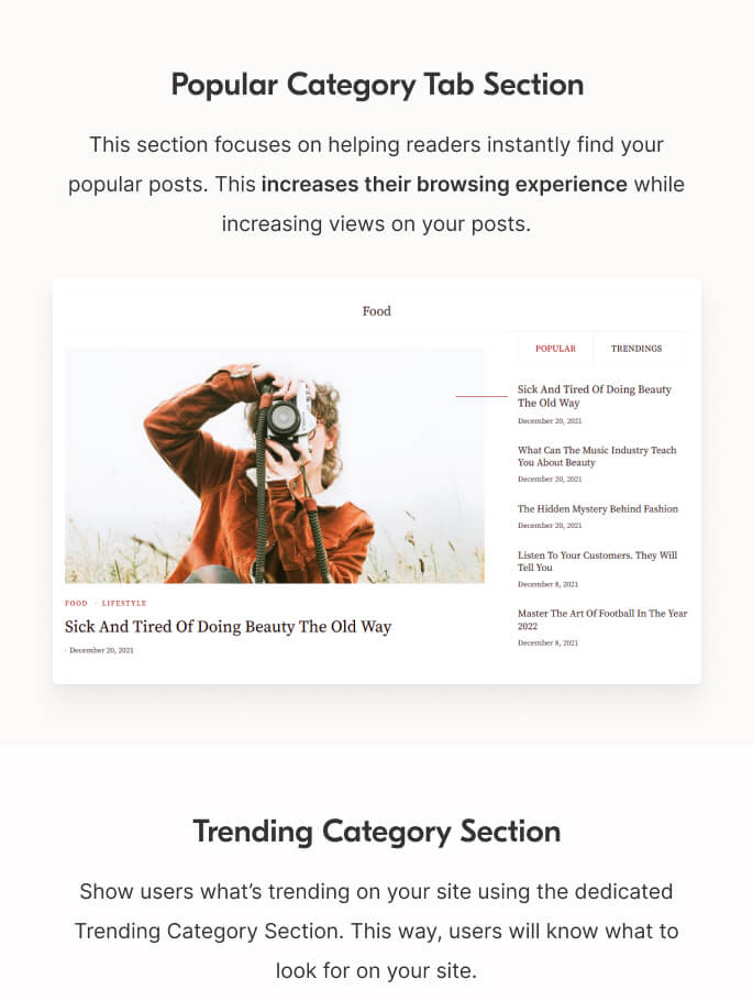 The Popular Category Section makes sure to highlight your important and popular posts based on various categories. There are 13 layouts along with other post options to define the appearance.