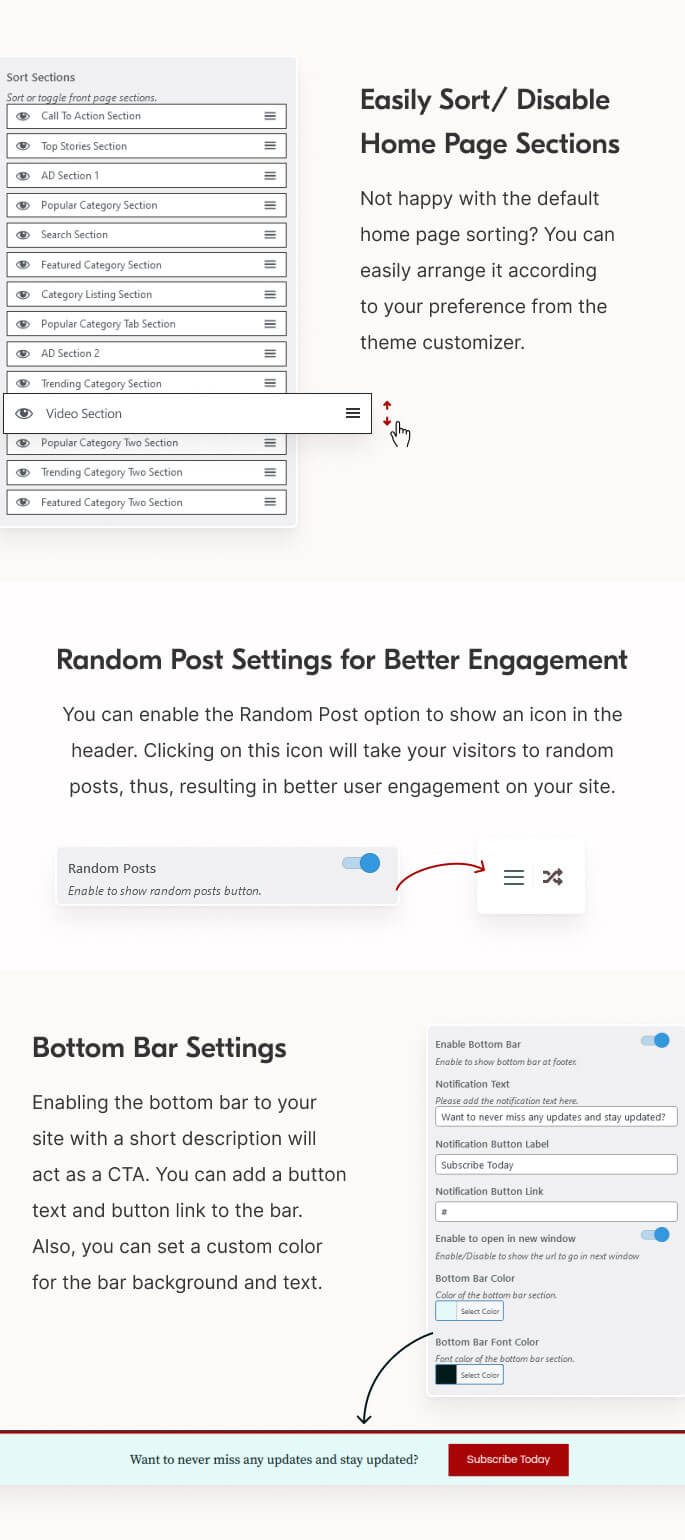 Instantly grab user attention with the News Ticket section on the homepage. This feature lets you highlight the latest or popular posts based on various categories. Further, the link in this section will take users to a specific page.