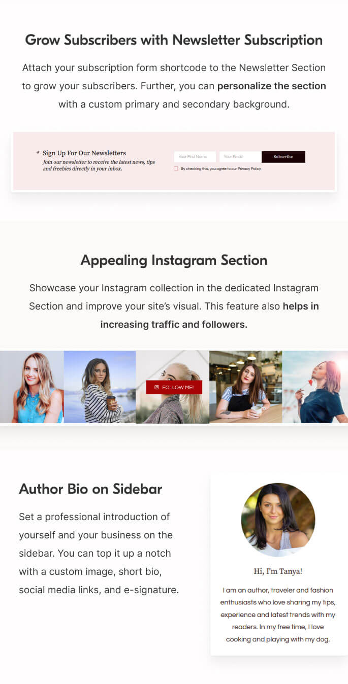 Generating leads is equally easy and fun with Blossom Magazine Pro. It has CTA sections, Newsletter Subscription, Instagram Section, and social media integration to help you with it. Plus, you can showcase your content using several delightful layouts and sections of the theme. Your audience will surely have a fiesta on your site.