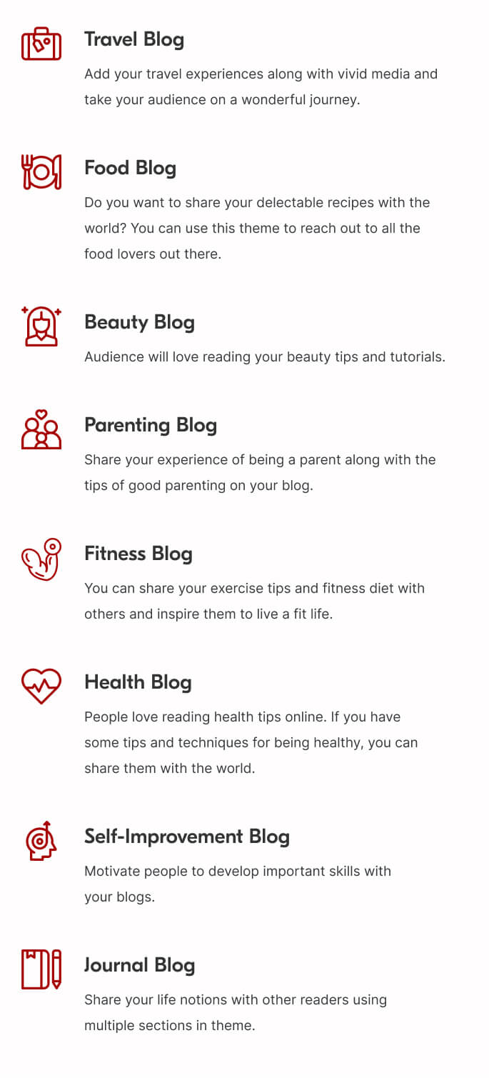 - Travel Blog – Add your travel experiences along with vivid media and take your audience on a wonderful journey.