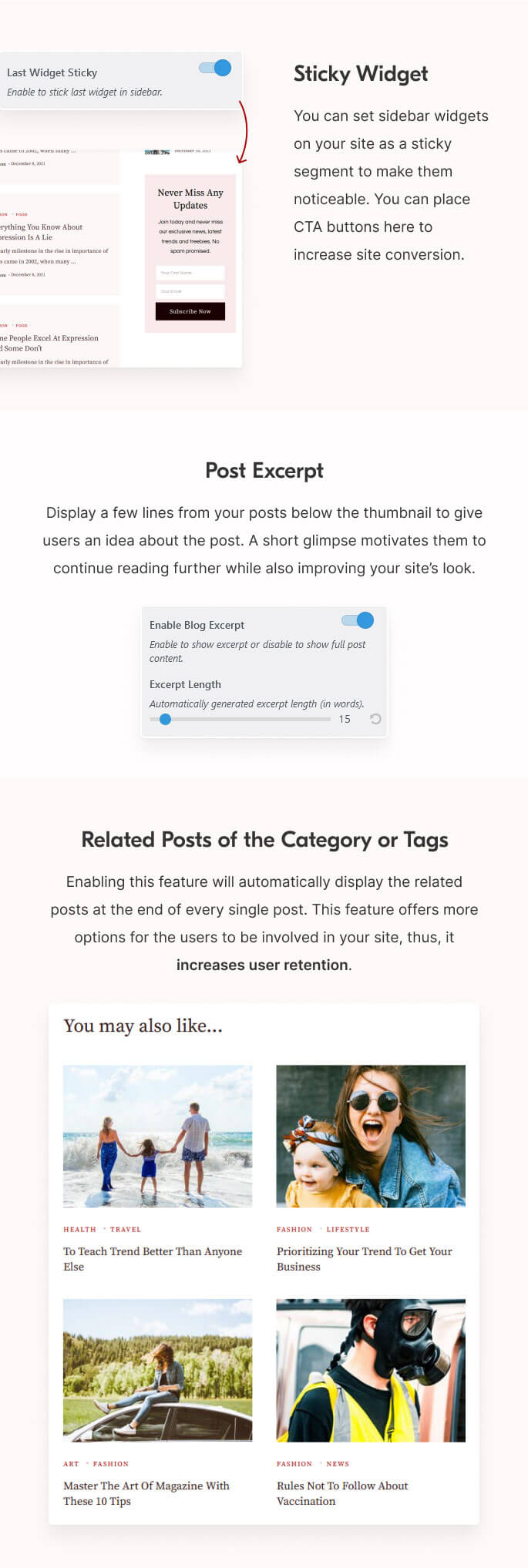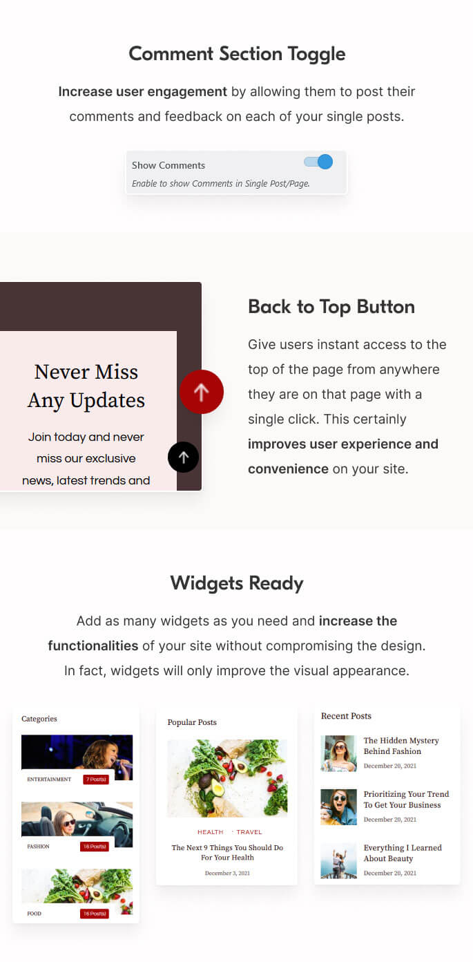 Enabling this feature will automatically display the related posts at the end of every single post. This feature offers more options for the users to be involved in your site, thus, it increases user retention.