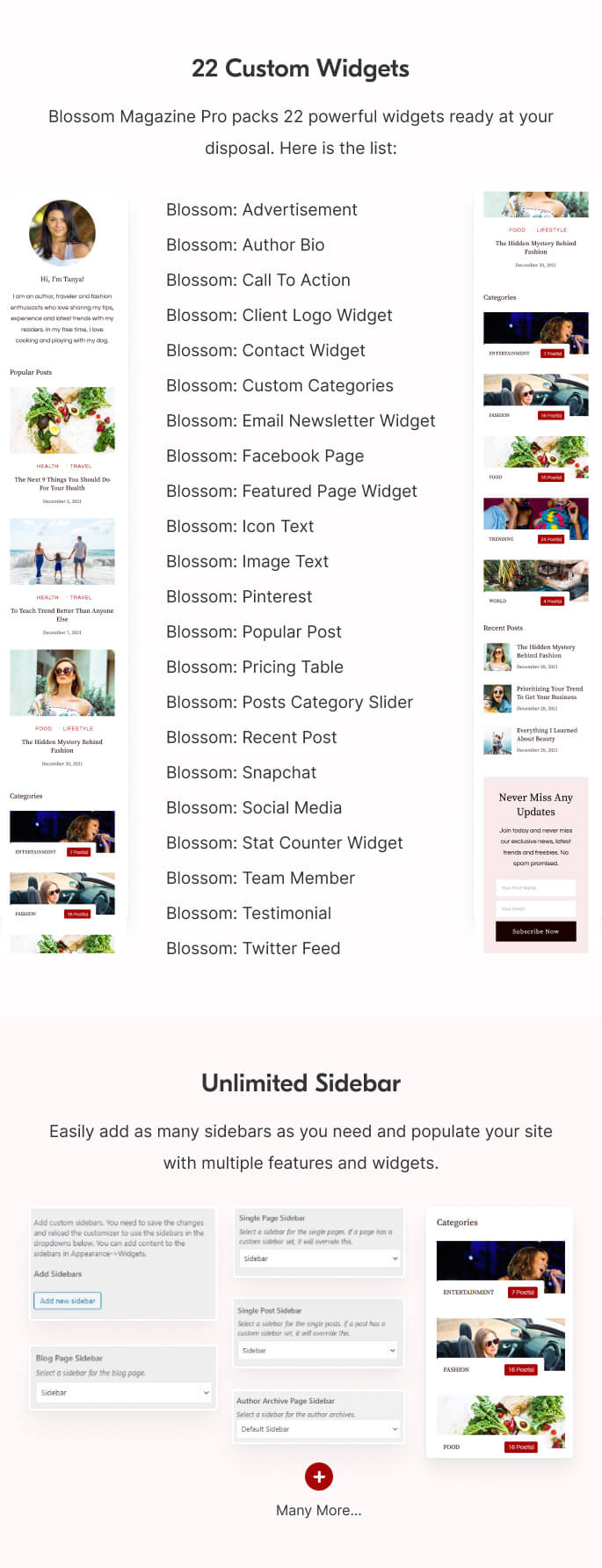 Blossom Magazine Pro packs 22 powerful widgets ready at your disposal. Here is the list: