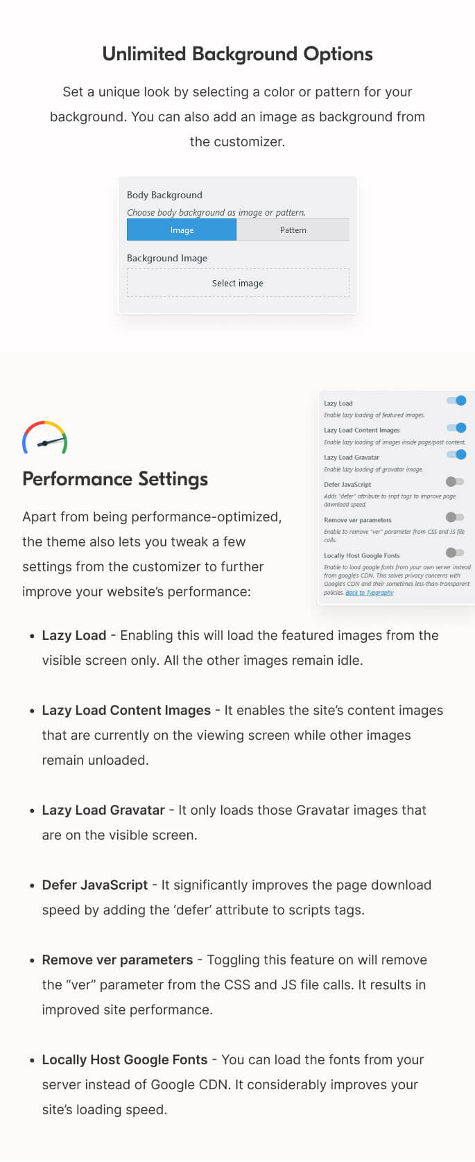 Apart from being performance-optimized, the theme also lets you tweak a few settings from the customizer to further improve your website’s performance: