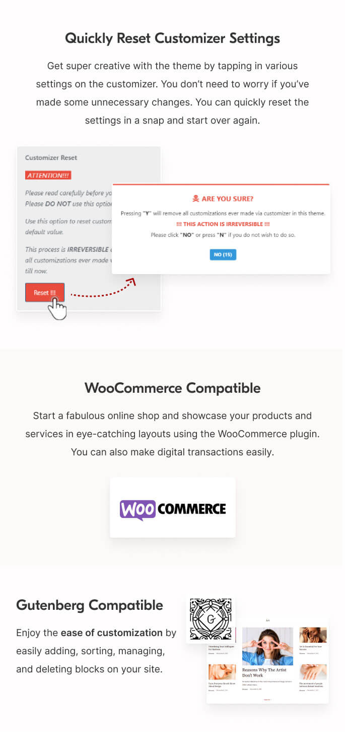Get super creative with the theme by tapping in various settings on the customizer. You don’t need to worry if you’ve made some unnecessary changes. You can quickly reset the settings in a snap and start over again.
