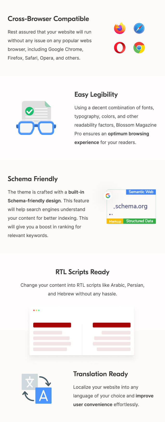 The theme is crafted with a built-in Schema-friendly design. This feature will help search engines understand your content for better indexing. This will give you a boost in ranking for relevant keywords.