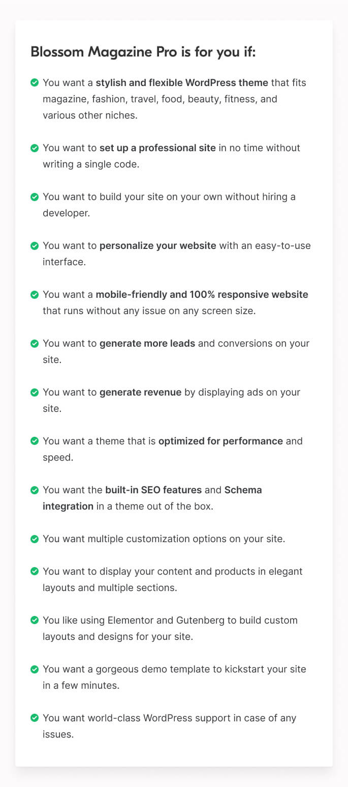 - You want a stylish and flexible WordPress theme that fits magazine, fashion, travel, food, beauty, fitness, and various other niches.