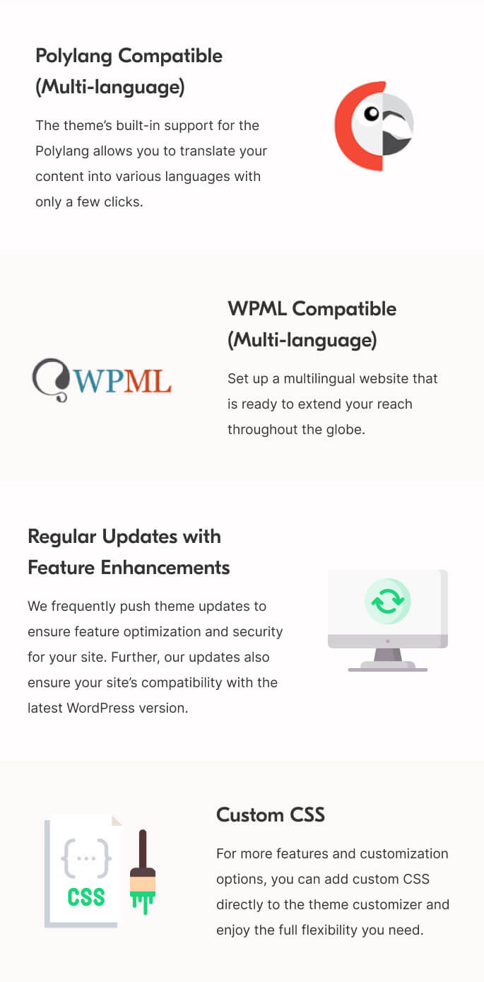The theme’s built-in support for the Polylang allows you to translate your content into various languages with only a few clicks.
