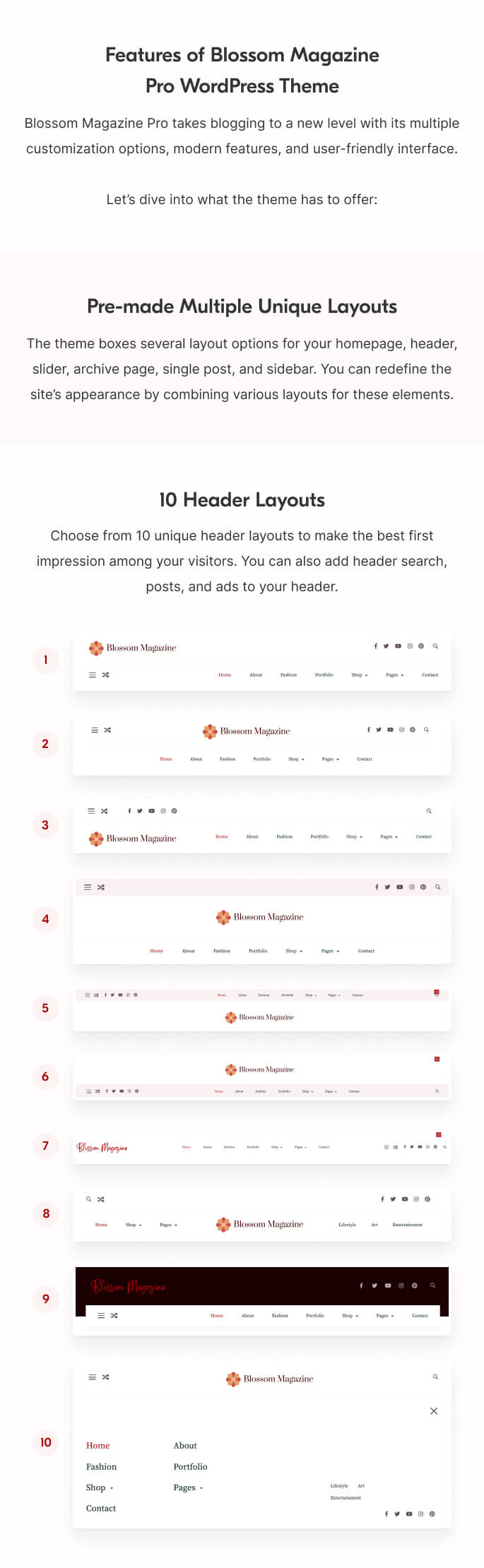 Choose from 10 unique header layouts to make the best first impression among your visitors. You can also add header search, posts, and ads to your header.