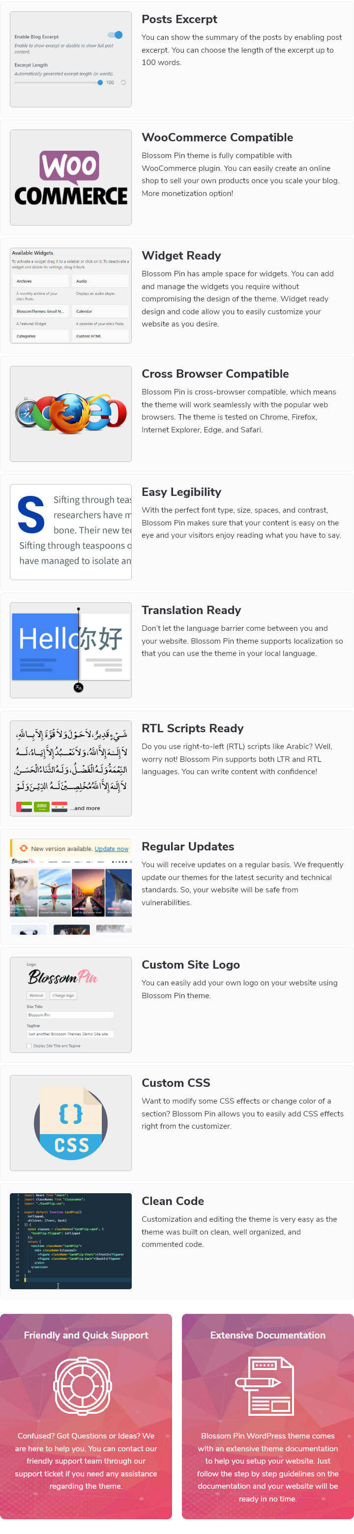 Blossom Pin is cross-browser compatible, which means the theme will work seamlessly with the popular web browsers. The theme is tested on Chrome, Firefox, Internet Explorer, Edge, and Safari.