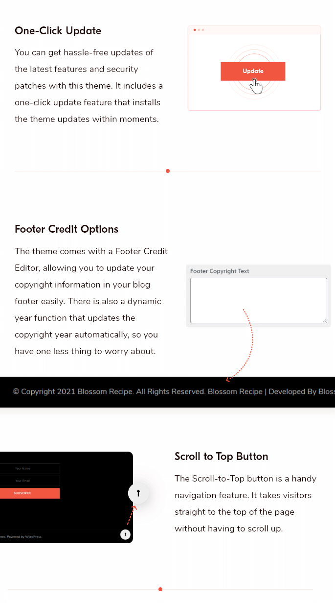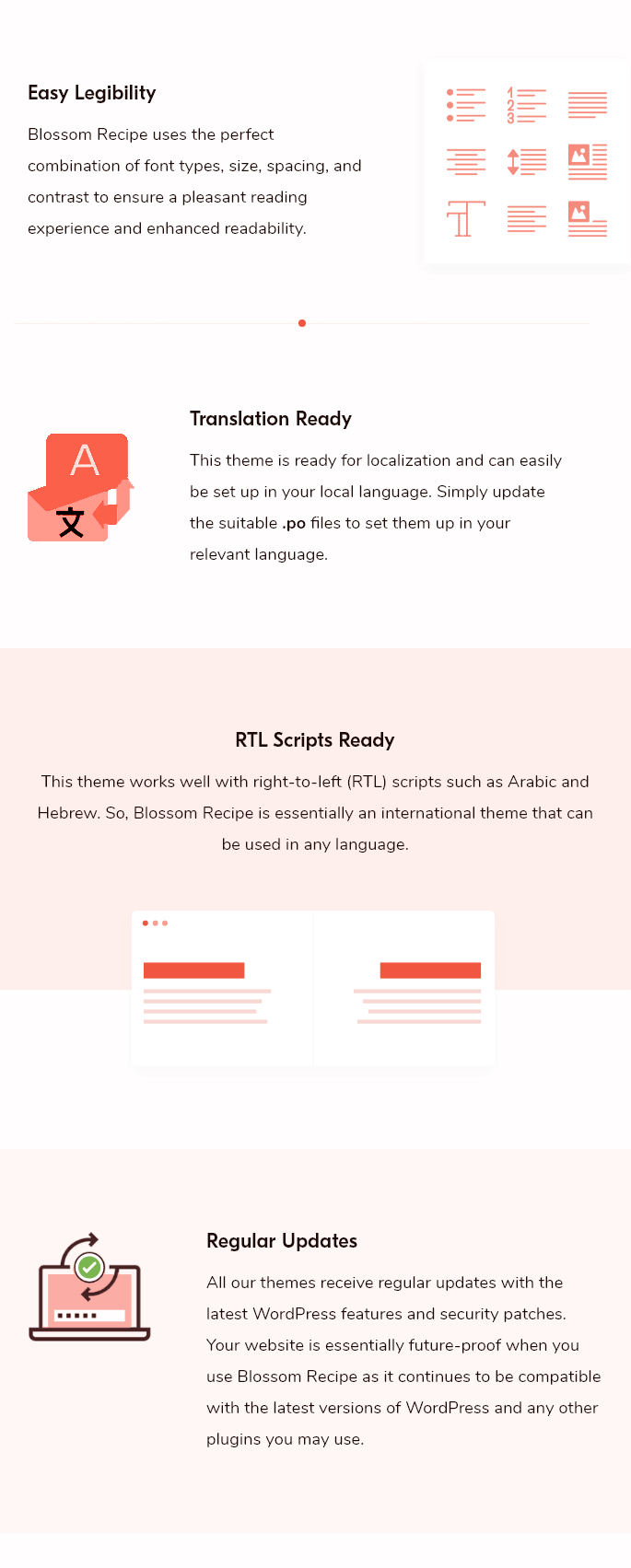 All our themes receive regular updates with the latest WordPress features and security patches. Your website is essentially future-proof when you use Blossom Recipe as it continues to be compatible with the latest versions of WordPress and any other plugins you may use.