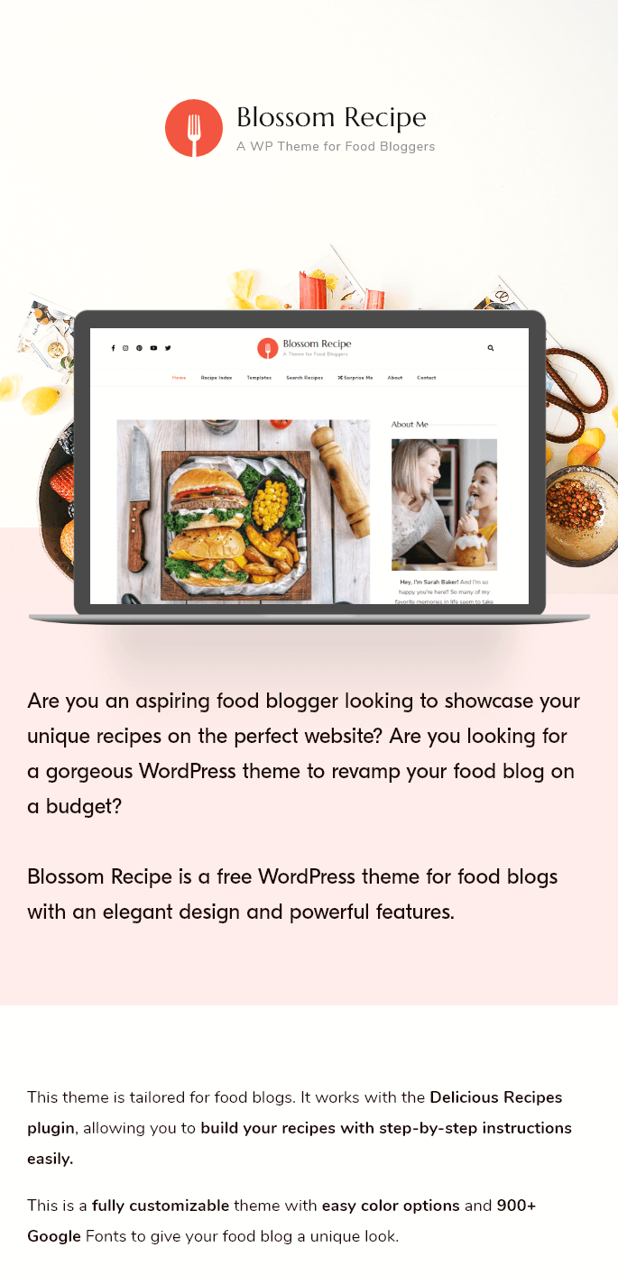 Blossom Recipe is a free WordPress theme for food blogs with an elegant design and powerful features.