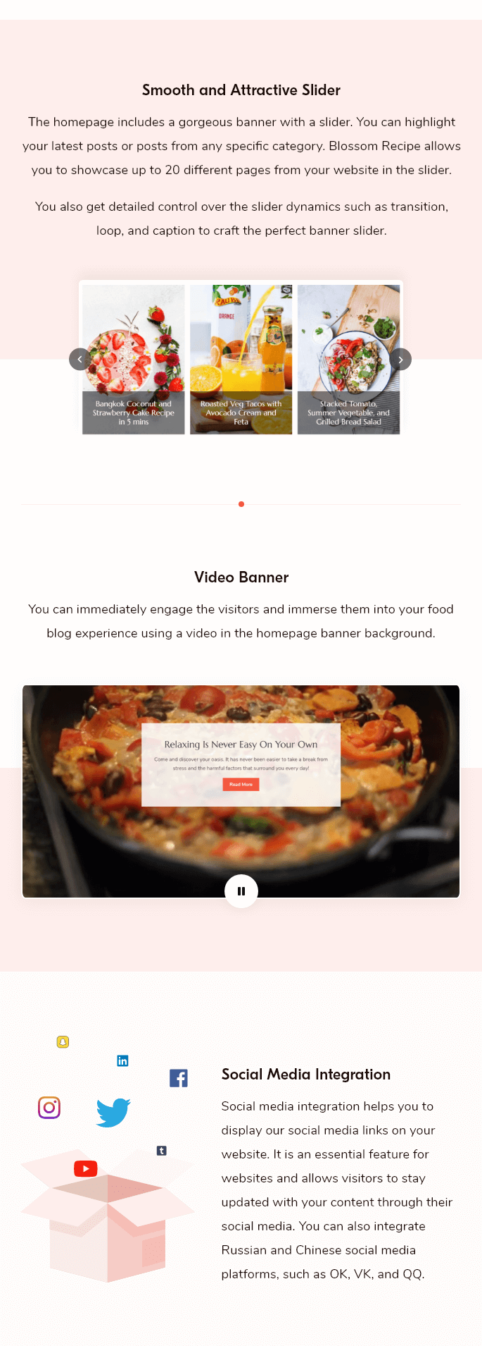 You can build your following on Instagram by showcasing your yummy Instagram posts directly on your website. Blossom Recipe comes with an appealing Instagram section where you can directly display posts from Instagram and draw visitors to your Instagram page.