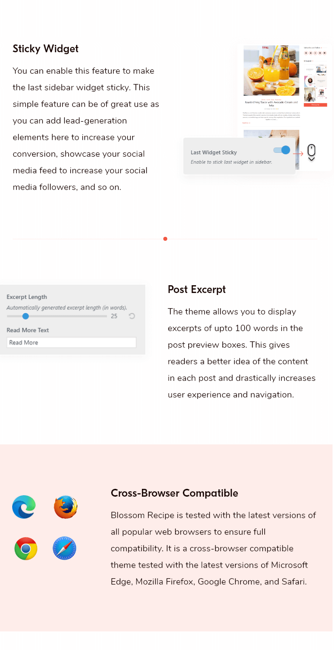 Blossom Recipe is tested with the latest versions of all popular web browsers to ensure full compatibility. It is a cross-browser compatible theme tested with the latest versions of Microsoft Edge, Mozilla Firefox, Google Chrome, and Safari.