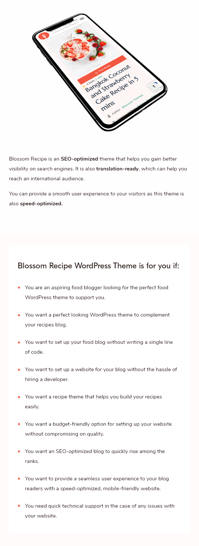 Blossom Recipe is an SEO-optimized theme that helps you gain better visibility on search engines. It is also translation-ready, which can help you reach an international audience.