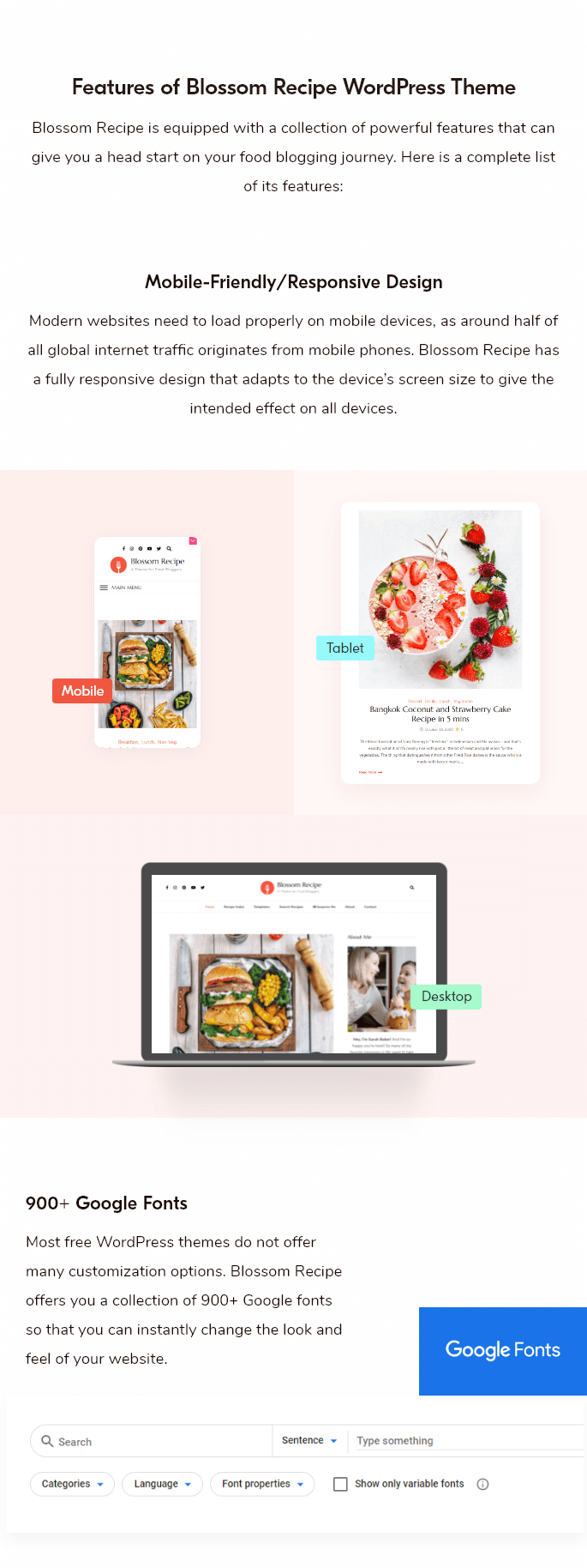 Most free WordPress themes do not offer many customization options. Blossom Recipe offers you a collection of 900+ Google fonts so that you can instantly change the look and feel of your website.