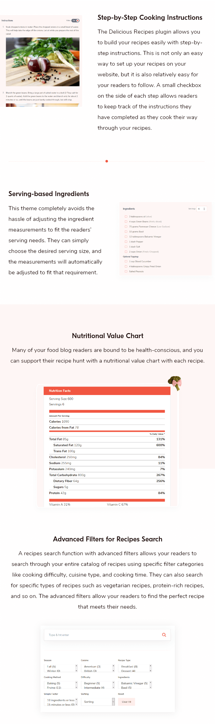 This theme completely avoids the hassle of adjusting the ingredient measurements to fit the readers’ serving needs. They can simply choose the desired serving size, and the measurements will automatically be adjusted to fit that requirement.