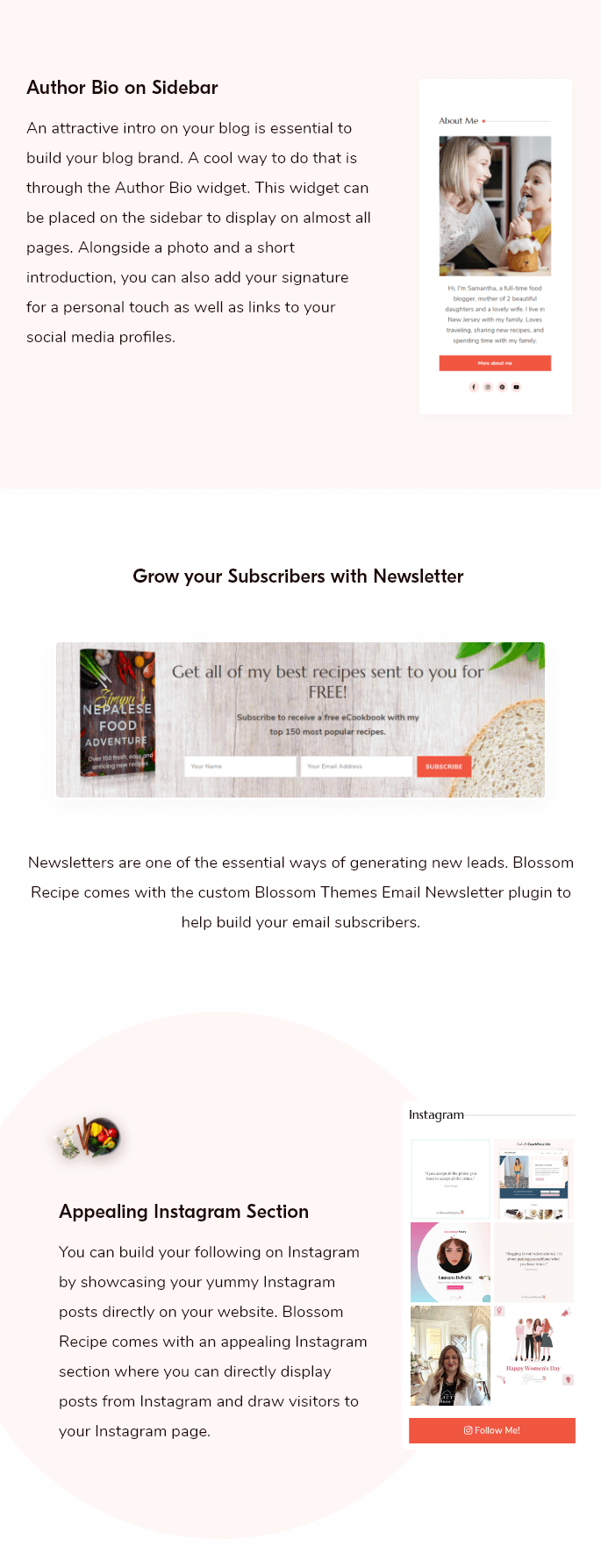 Newsletters are one of the essential ways of generating new leads. Blossom Recipe comes with the custom Blossom Themes Email Newsletter plugin to help build your email subscribers.