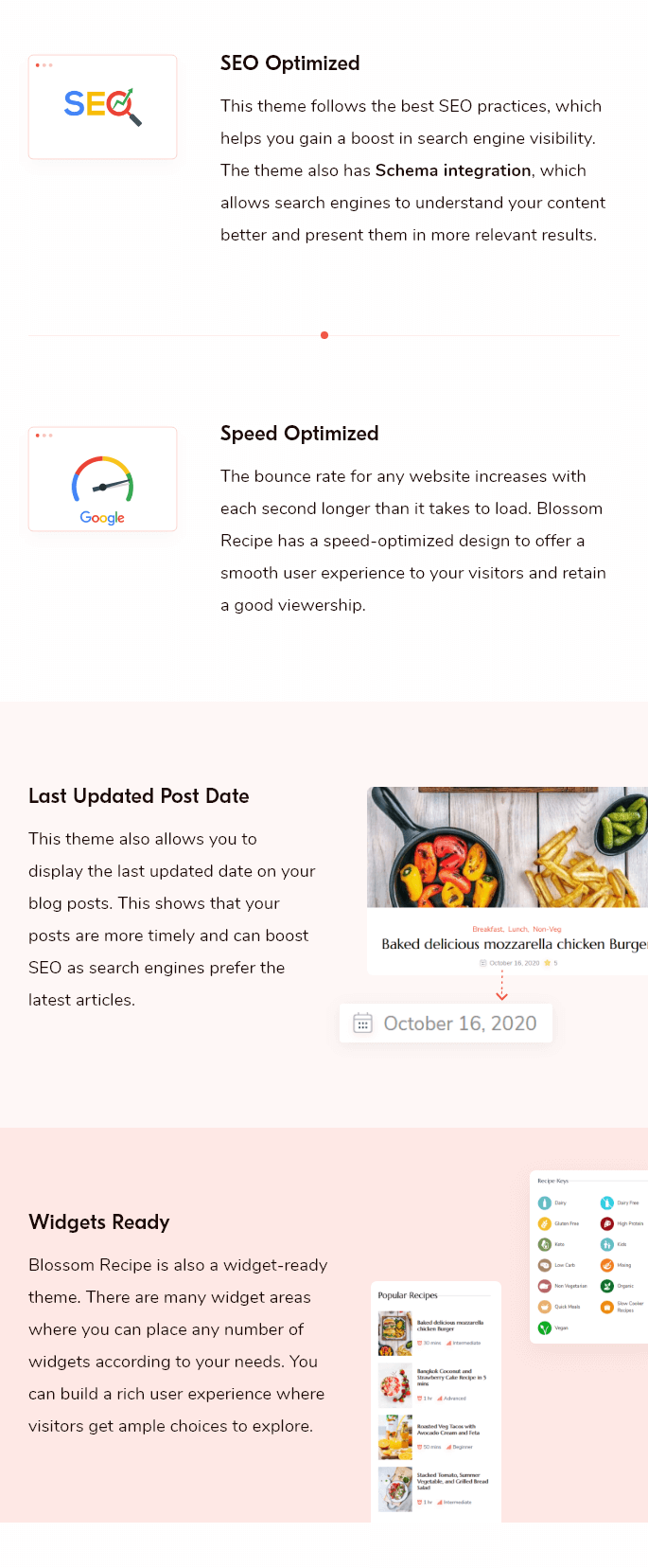 The bounce rate for any website increases with each second longer than it takes to load. Blossom Recipe has a speed-optimized design to offer a smooth user experience to your visitors and retain a good viewership.