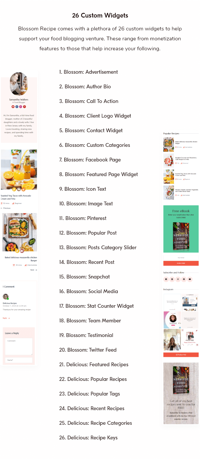 Blossom Recipe comes with a plethora of 26 custom widgets to help support your food blogging venture. These range from monetization features to those that help increase your following.