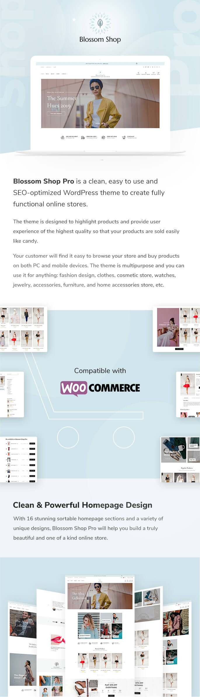 Blossom Shop Pro is a clean, easy to use and SEO-optimized WordPress theme to create fully functional online stores. The theme is designed to highlight products and provide user experience of the highest quality so that your products are sold easily like candy.