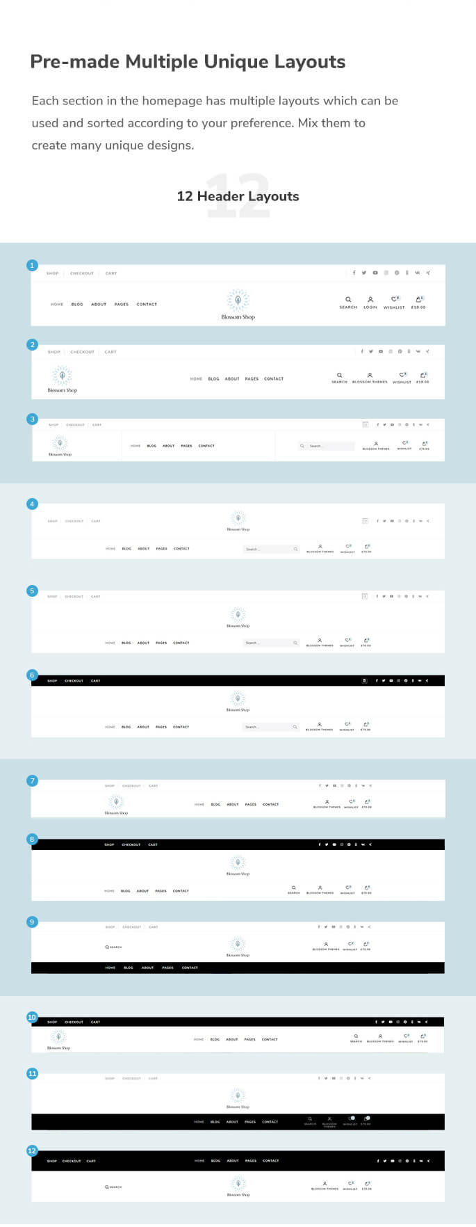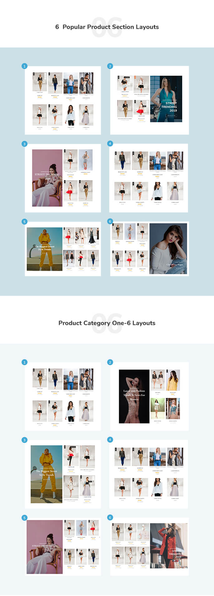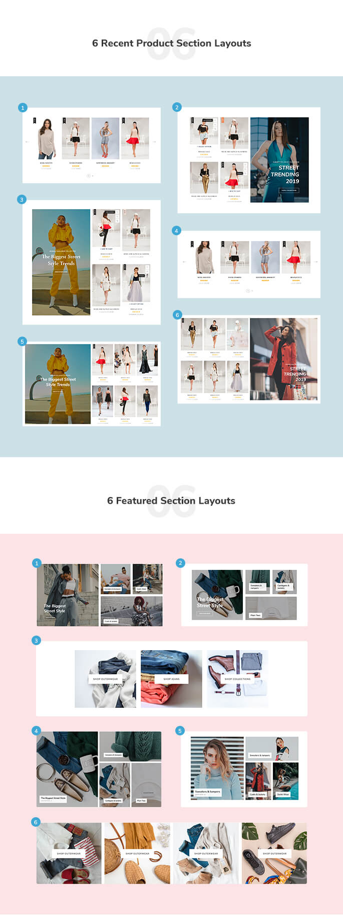 Each section in the homepage has multiple layouts which can be used and sorted according to your preference. Mix them to create many unique designs.