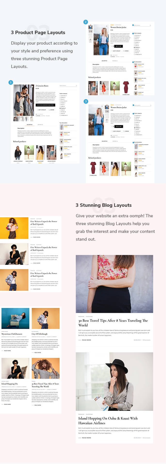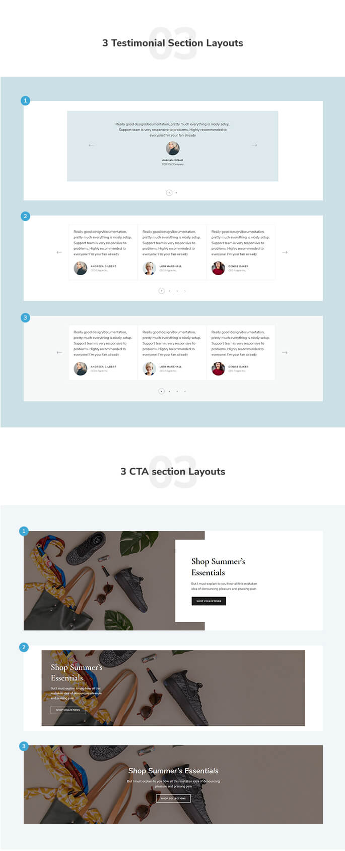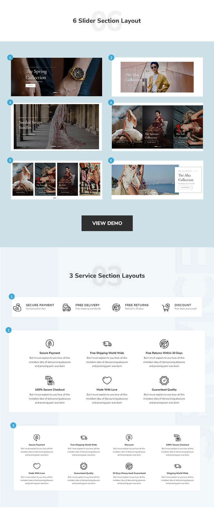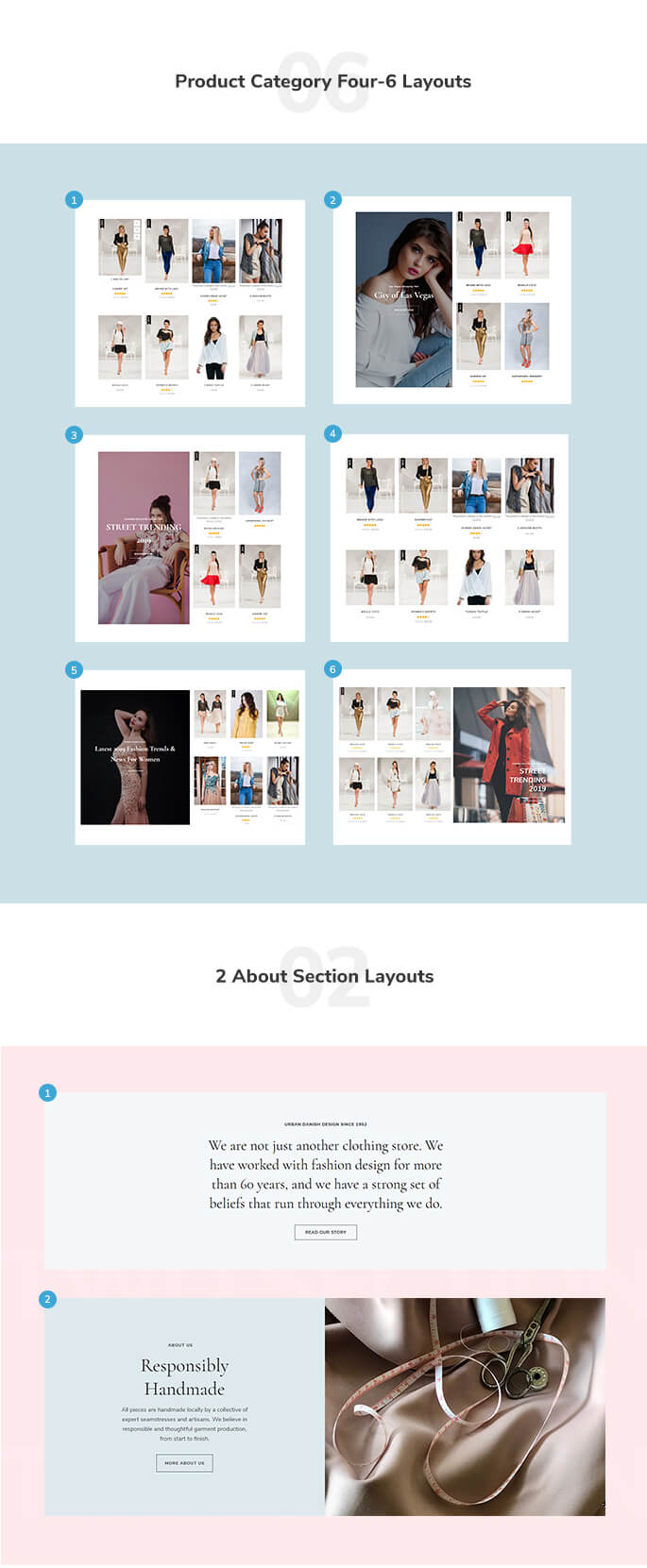 Each section in the homepage has multiple layouts which can be used and sorted according to your preference. Mix them to create many unique designs.