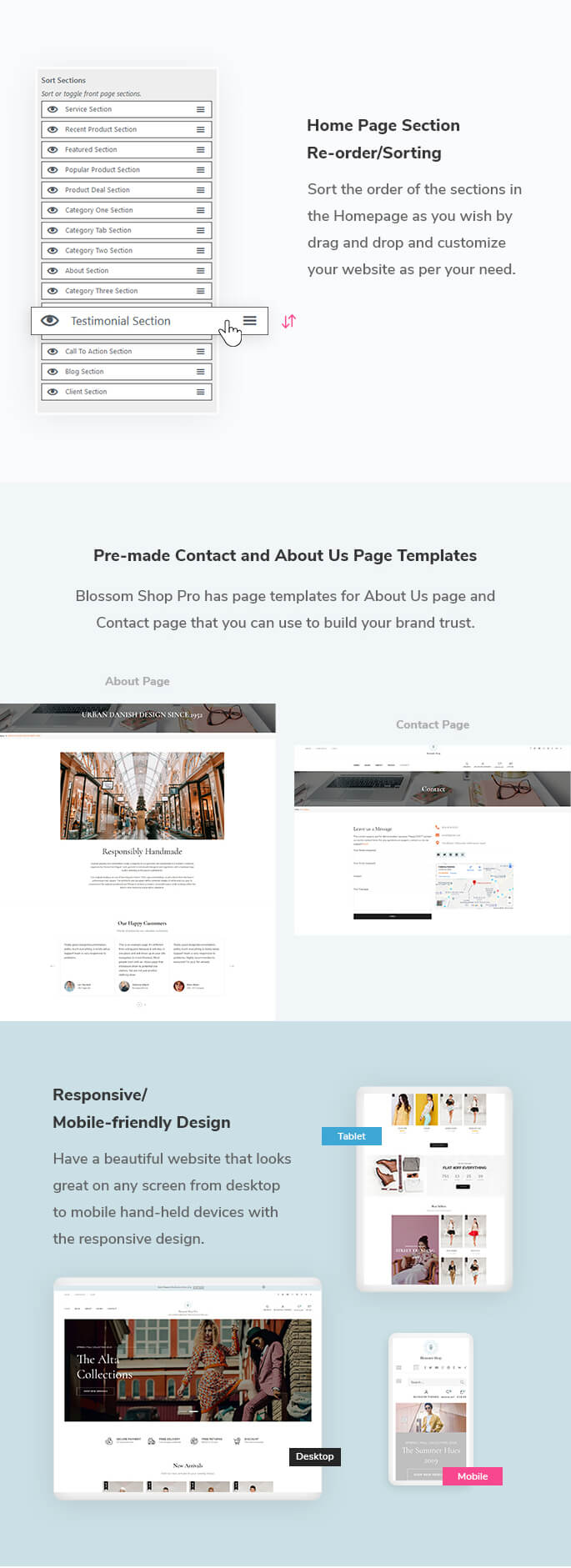 Blossom Shop Pro has page templates for About Us page and Contact page that you can use to build your brand trust.