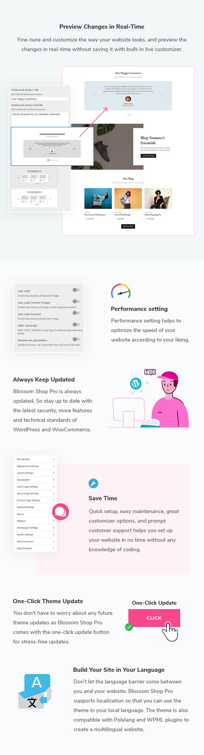 Blossom Shop Pro is always updated. So stay up to date with the latest security, more features and technical standards of WordPress and WooCommerce.