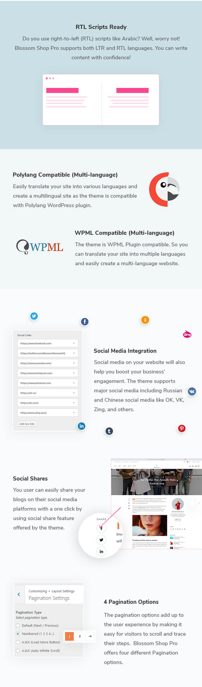 Don’t let the language barrier come between you and your website. Blossom Shop Pro supports localization so that you can use the theme in your local language. The theme is also compatible with Polylang and WPML plugins to create a multilingual website.