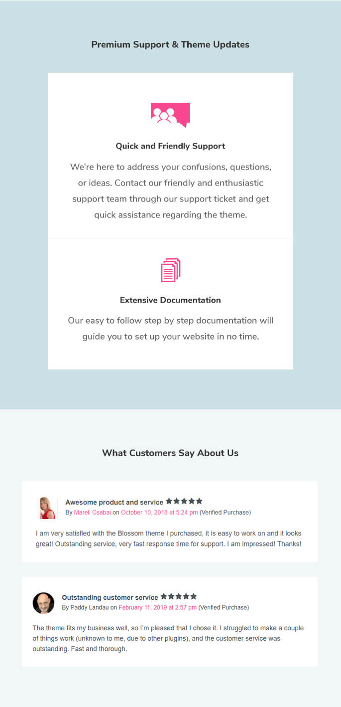 I honestly can’t say enough about how exceptional the customer service team is at Blossom Themes. They are seriously amazing and the Blossom Shop Pro theme is gorgeous! It’s so easy to set up and customise. My site looks amazing and I’m just so happy that I made the decision to buy this theme. Thanks so much!