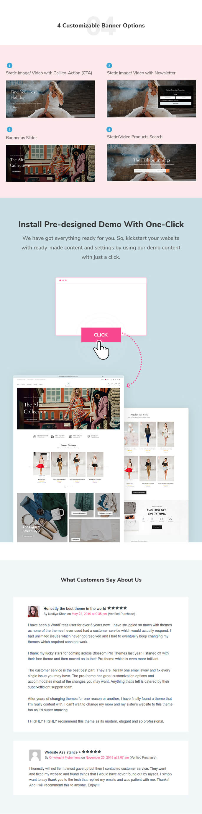 The pagination options add up to the user experience by making it easy for visitors to scroll and trace their steps. Blossom Shop Pro offers four different Pagination options.